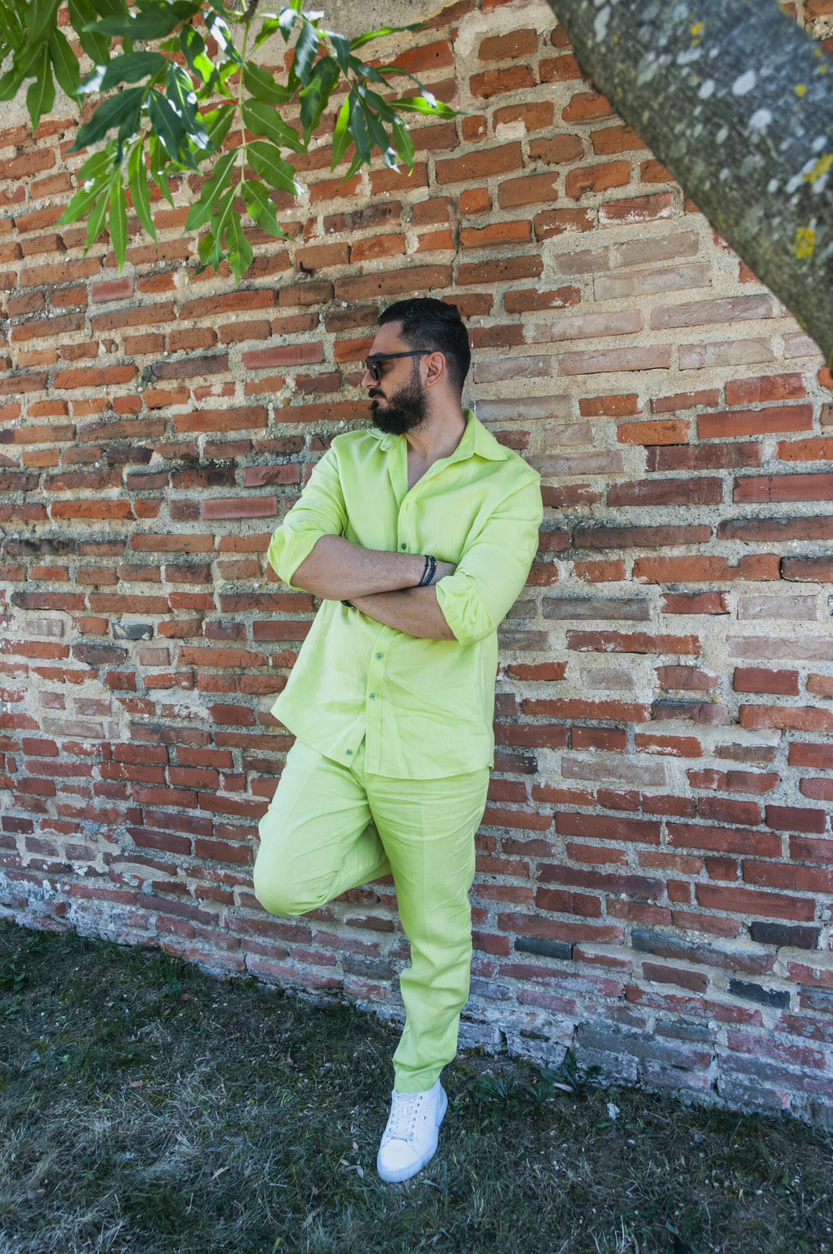 Cămașă realizată integral din in 100%, într-o nuanță vibrantă de verde lime, creată pentru bărbatul care apreciază eleganța relaxată și materialele naturale. Croiala lejeră oferă confort sporit în zilele călduroase, iar textura naturală a inului permite pielii să respire.