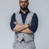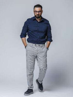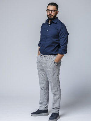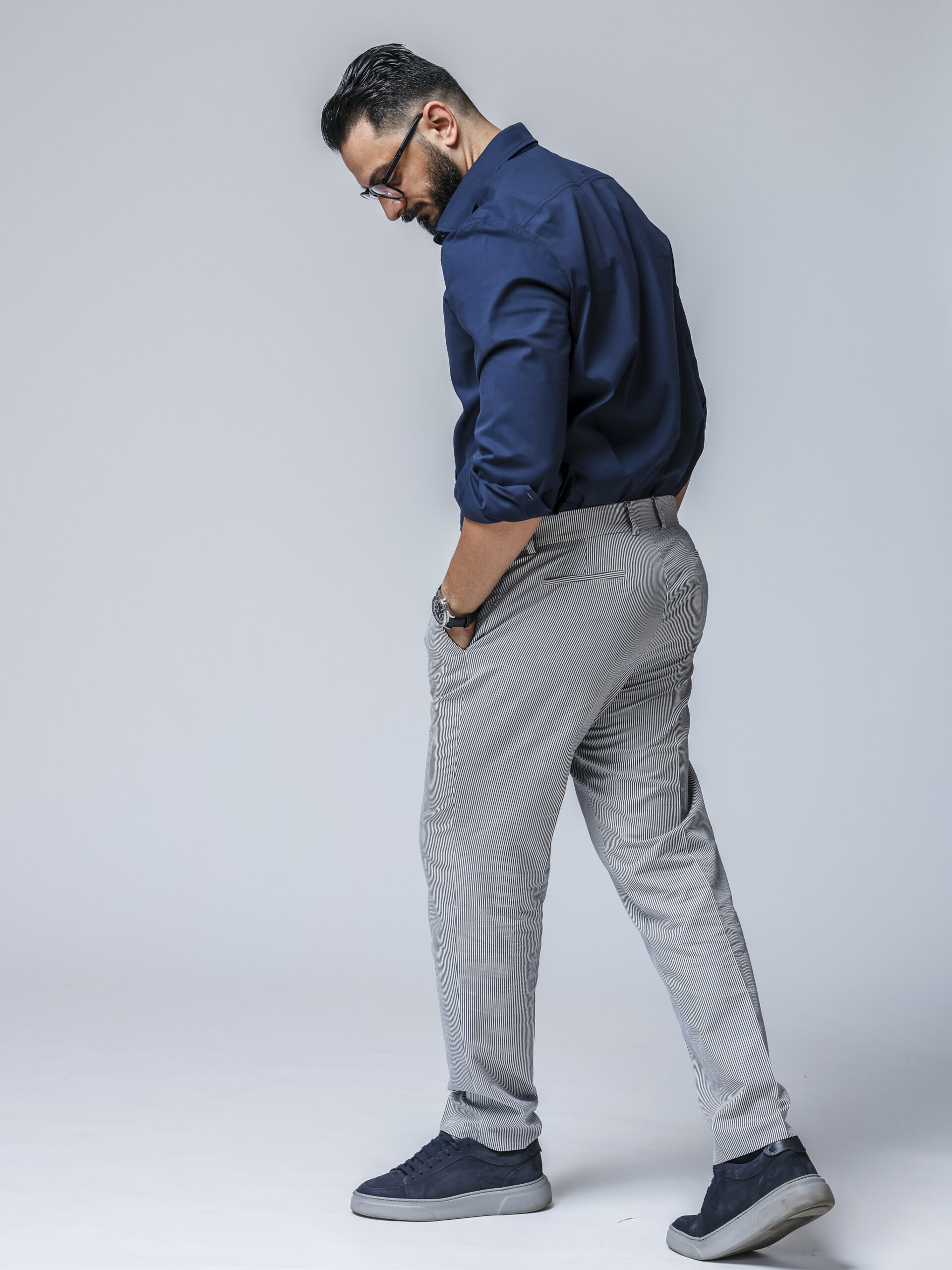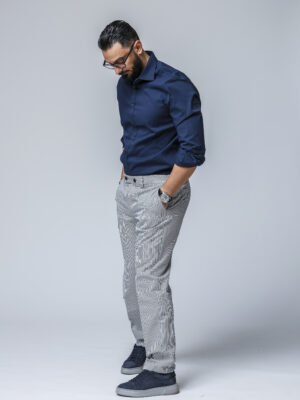 Un model versatil și modern, acești pantaloni din stofă ușoară cu dungi micro-verticale gri pe fond gri deschis oferă un look curat și rafinat, potrivit atât pentru zilele active din oraș, cât și pentru ocazii smart-casual.
