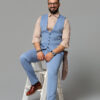 Pantaloni eleganți din stofă ușoară, în nuanță albastru deschis, creați să completeze vesta asortată sau să fie purtați solo în ținute smart-casual.