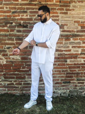Setul complet din in alb este expresia supremă a stilului casual premium pentru vreme caldă. Realizat integral din 100% in natural, setul reunește trei piese esențiale – cămașă, pantaloni și vestă – pentru un look unitar, elegant și relaxat.