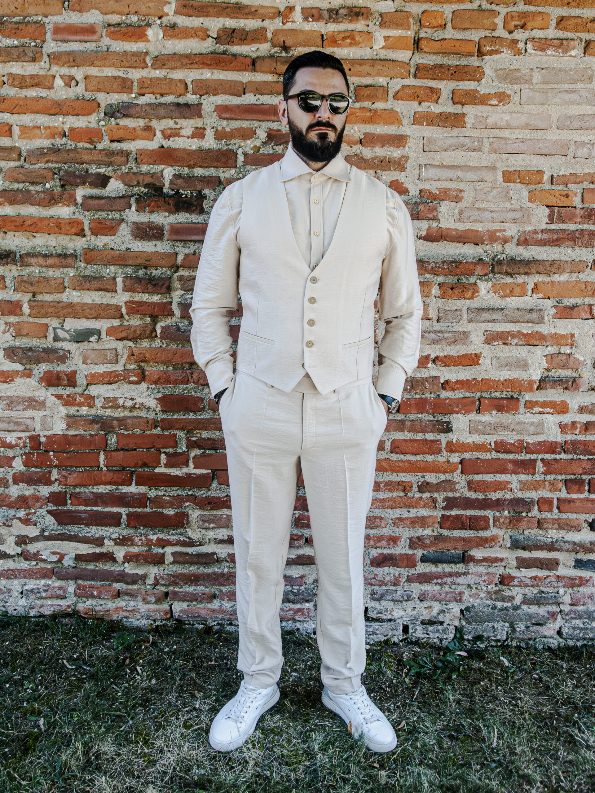 Set complet bărbați din in crem (cămașă, pantaloni, vestă)