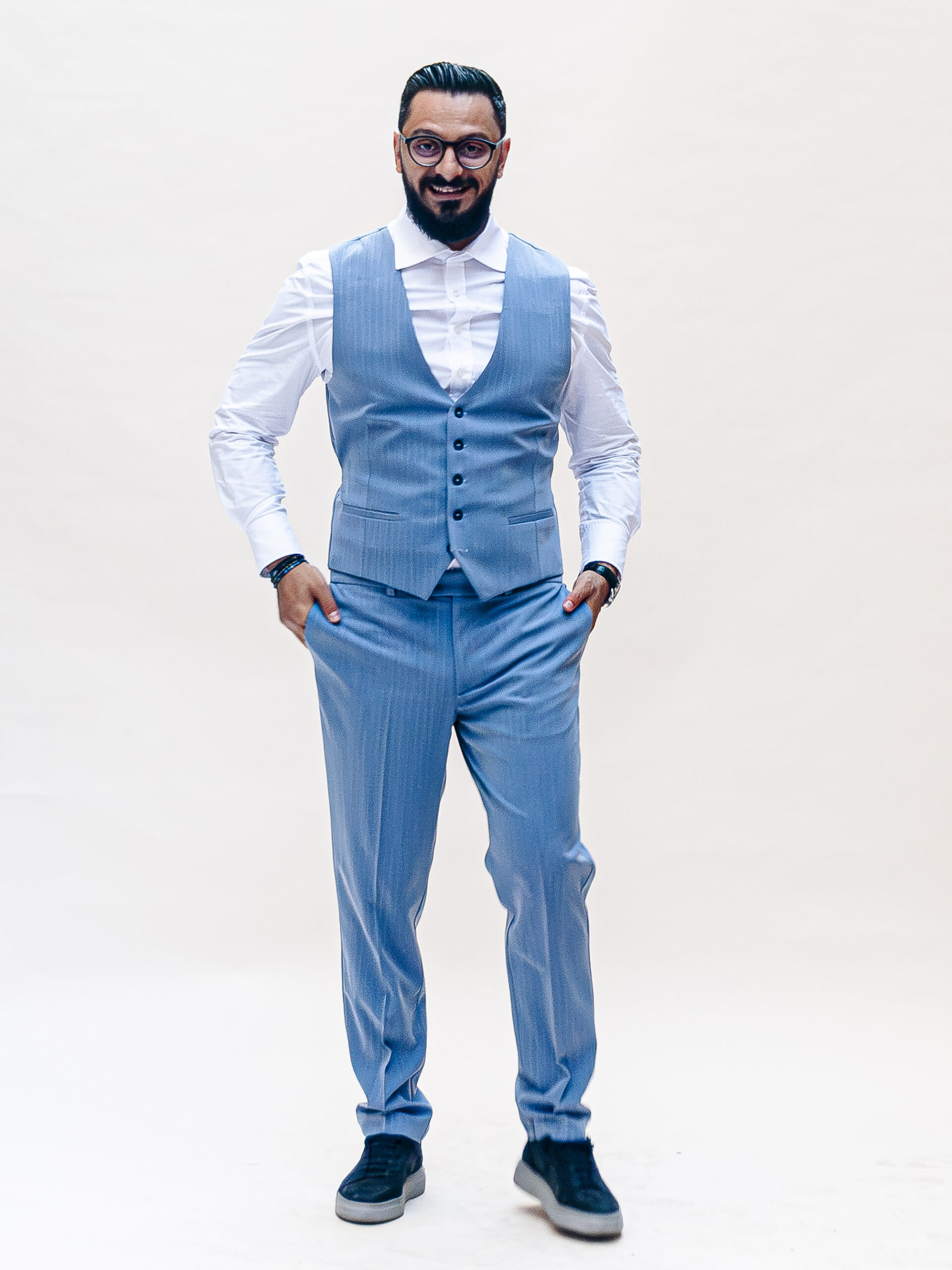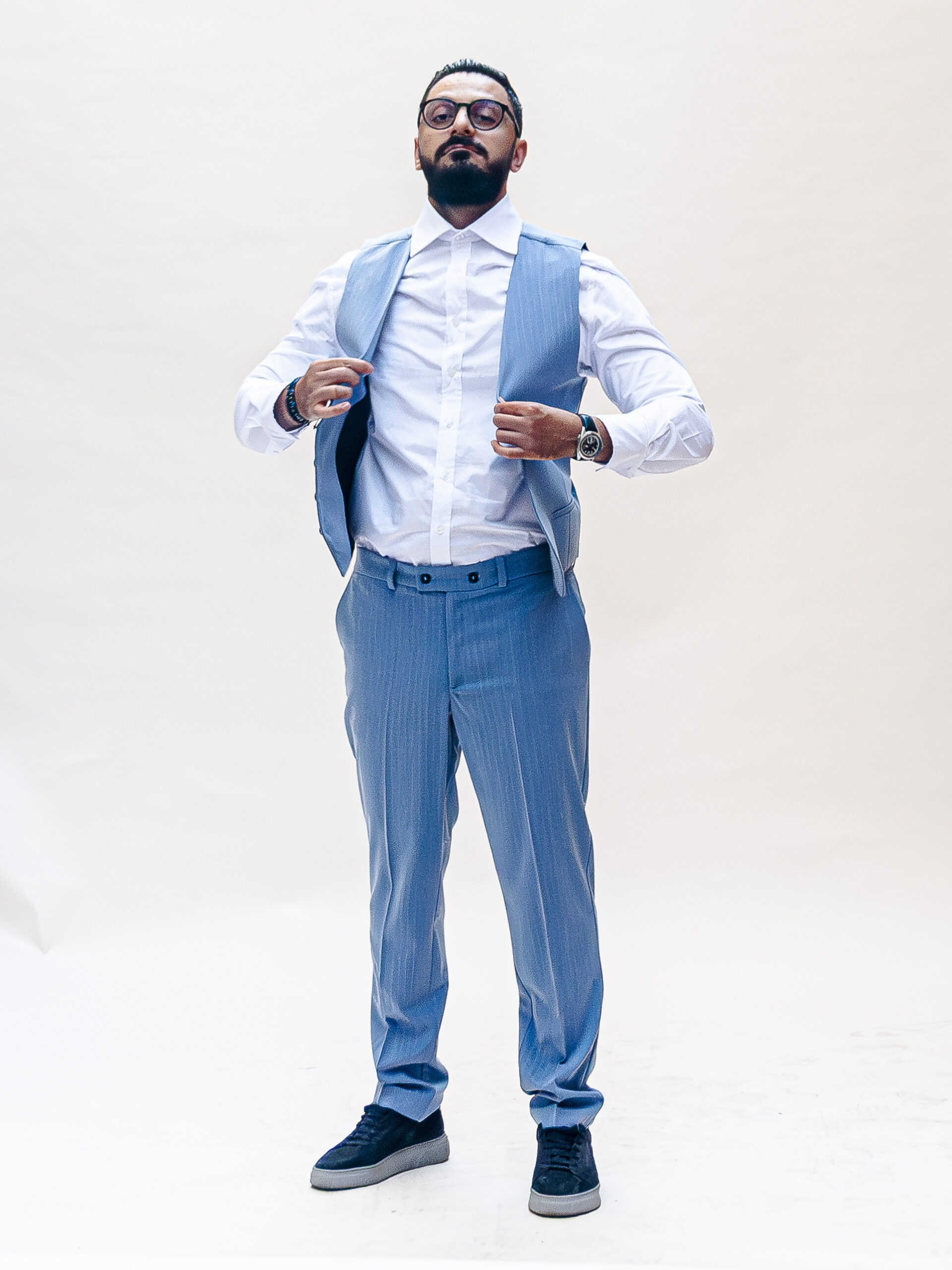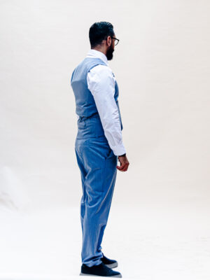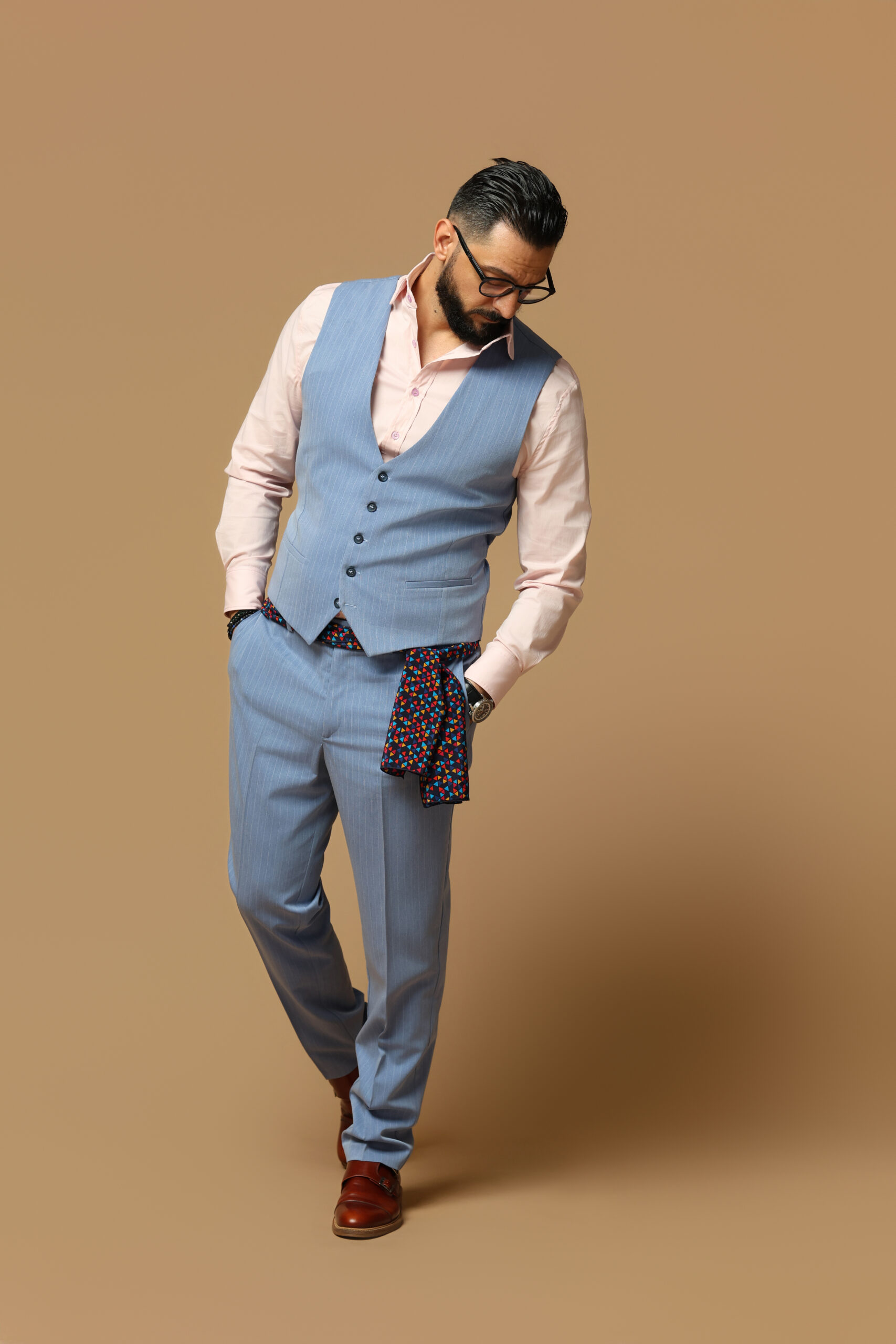 Un simbol al rafinamentului masculin, această vestă din stofă de calitate superioară este concepută pentru bărbatul care dorește să îmbine eleganța clasică cu versatilitatea modernă. Nuanța de albastru deschis, îmbogățită cu dungi fine verticale, adaugă un plus de personalitate, păstrând în același timp un aer sofisticat și ordonat.