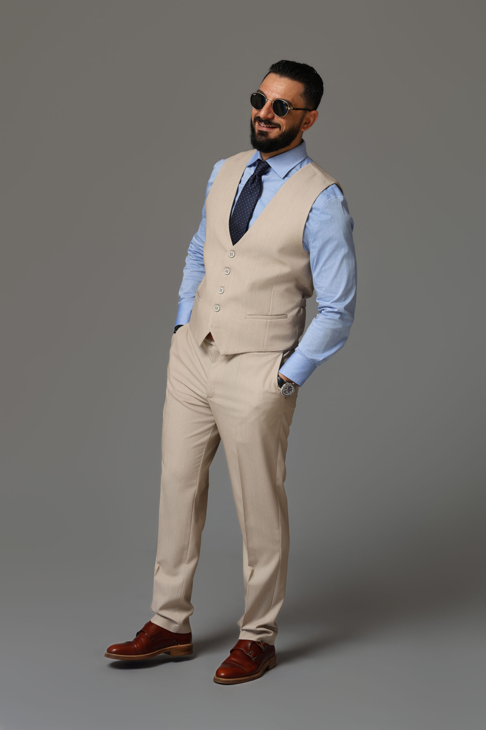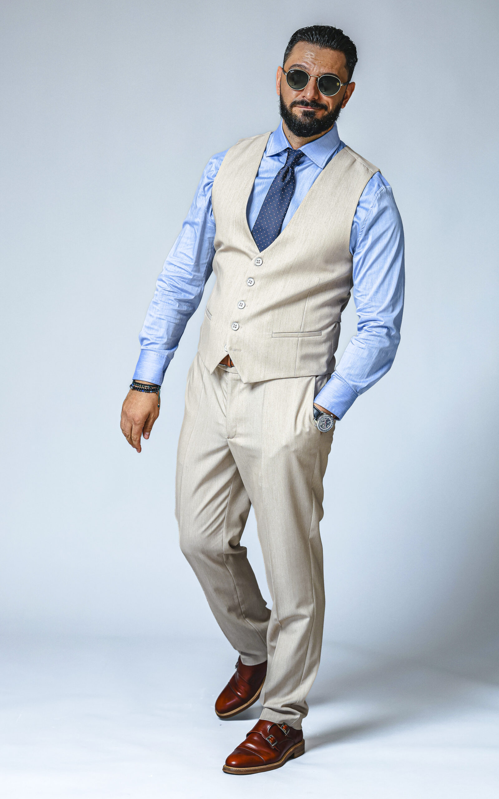 Poart-o cu cămașă albastru deschis sau albă și pantaloni în tonuri naturale (bej, grej, albastru închis). Completează cu loafers cognac sau sneakers albi pentru un contrast modern.