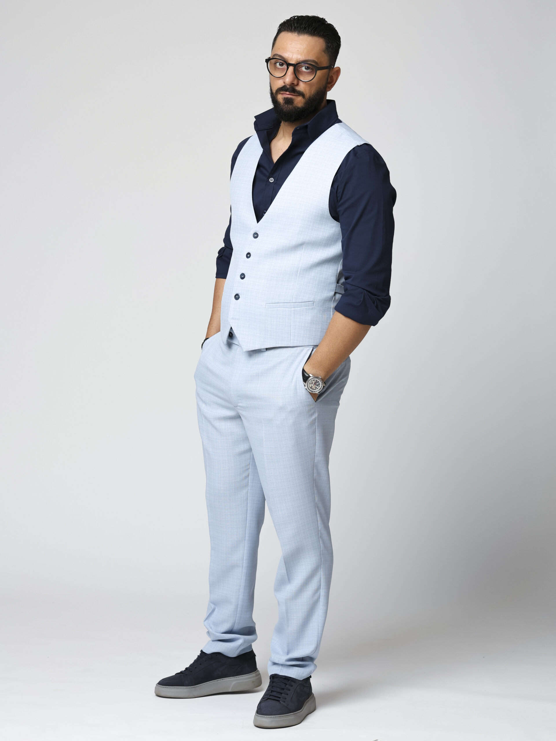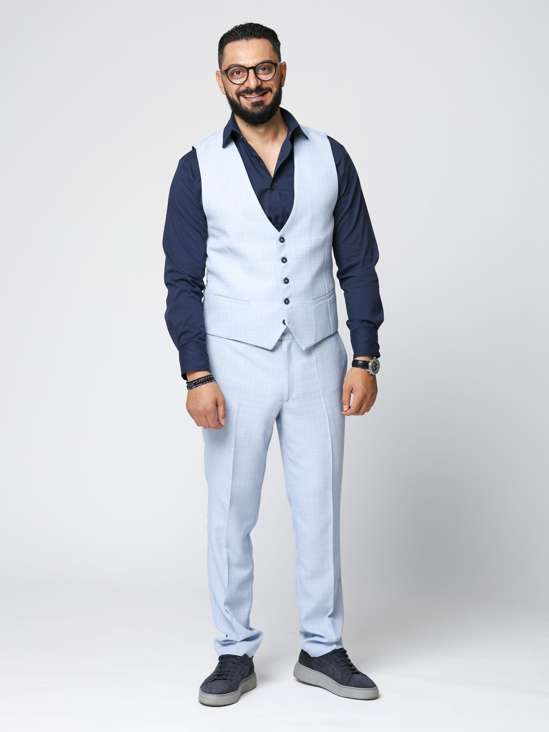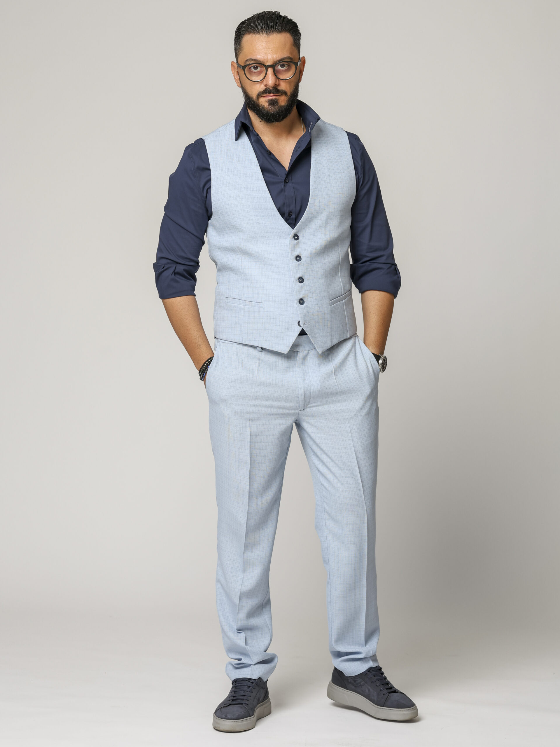 O piesă versatilă și elegantă, această vestă din stofă de calitate superioară este creată pentru bărbatul modern care apreciază rafinamentul discret. Modelul bleu cu carouri subtile adaugă un plus de textură și stil, fiind alegerea ideală pentru ținute smart casual sau elegante.