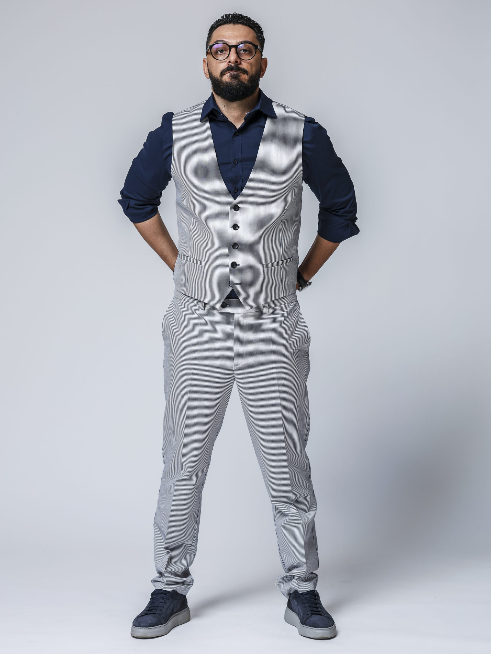 O piesă esențială pentru garderoba smart-casual, această vestă din stofă fină de bumbac 100% are un pattern discret de micro-dungi gri care alungește silueta și adaugă rafinament fără a fi ostentativă.