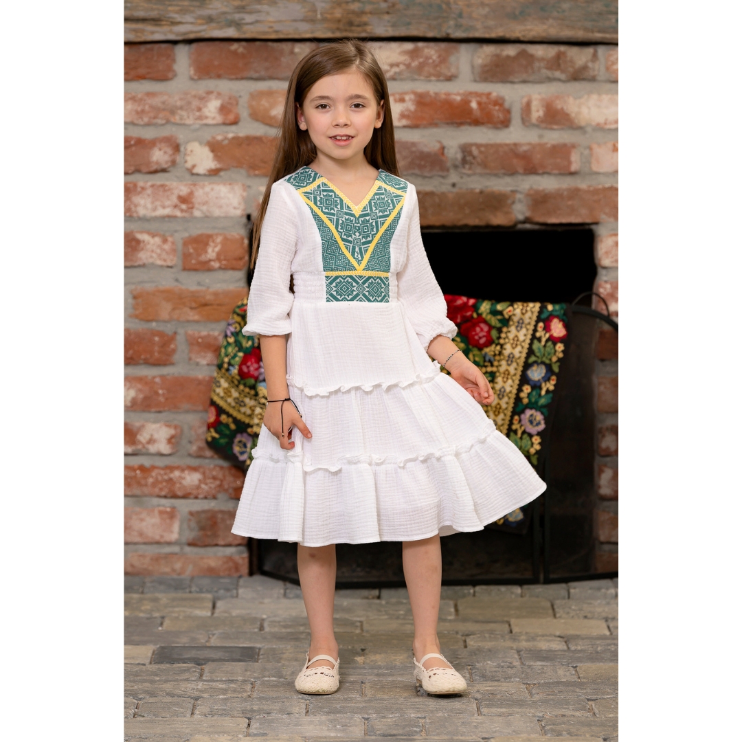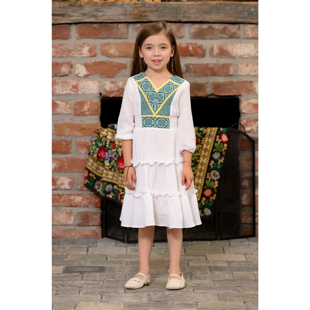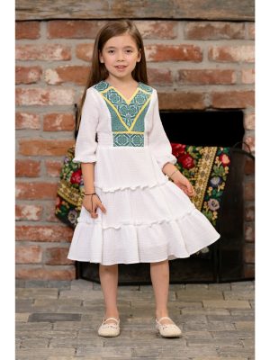 Broderia geometrică în nuanțe de verde și galben, amplasată în zona pieptului, evocă armonia motivelor tradiționale românești și oferă o notă proaspătă și autentică. Croiala lejeră, mânecile trei sferturi, volănașele din zona taliei și fusta în trepte creează o siluetă diafană și jucăușă, ideală pentru micile prințese.
